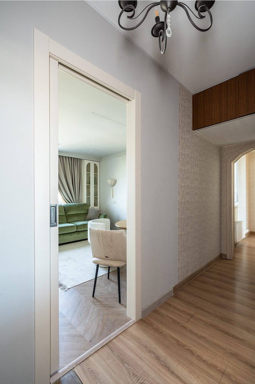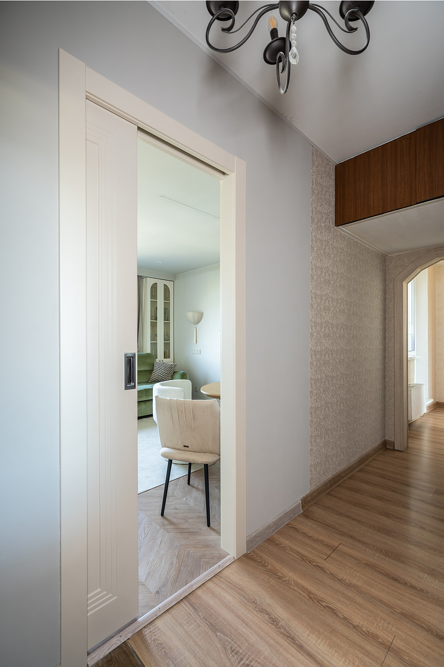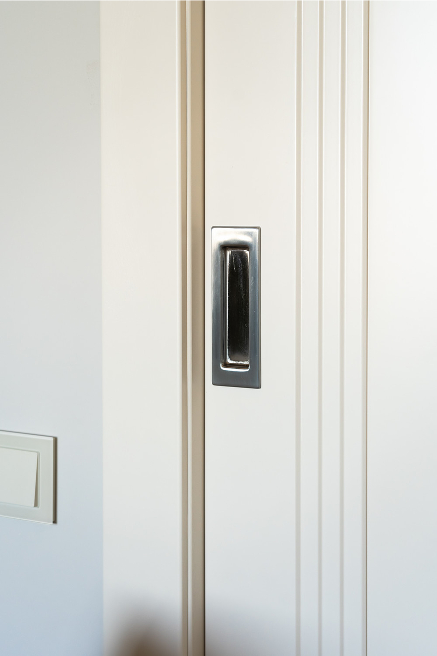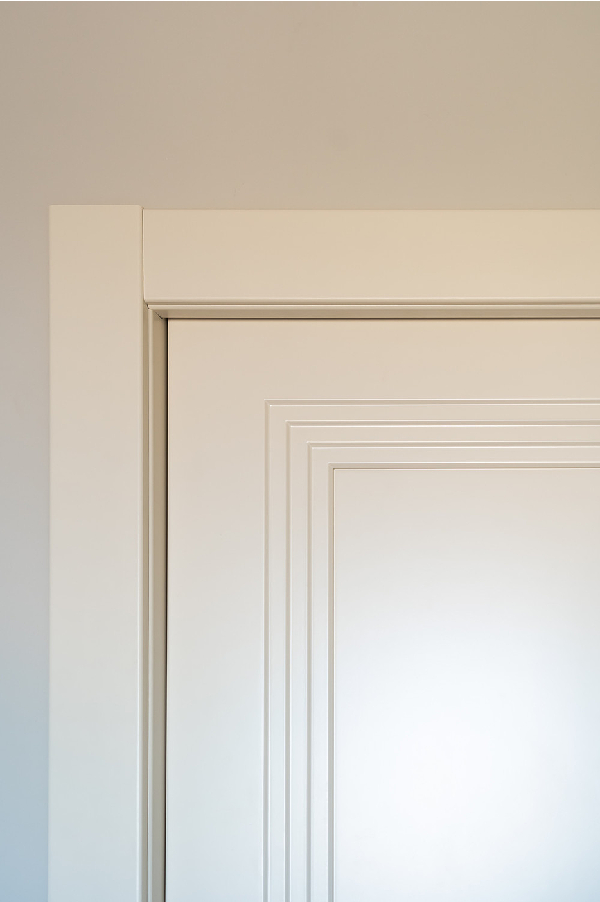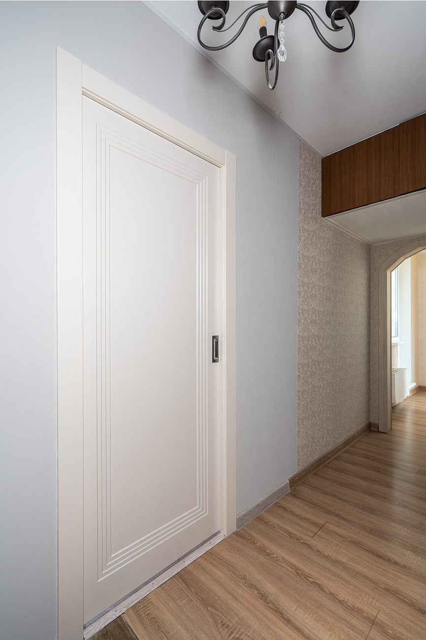 Дверное полотно со ступенчатой фрезеровкой покрыто тремя слоями эмали. Ездить будет на роликах по съемной направляющей. Такая выдержит вес до 80 килограммов. В предусмотренные пазы встают наличники. А плавность хода обеспечит двухсторонний доводчик.