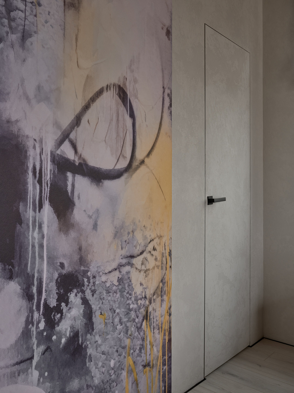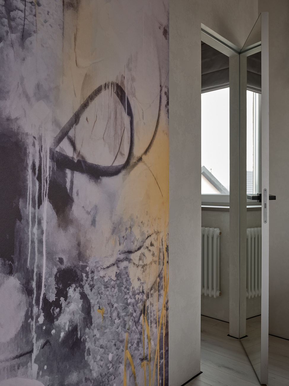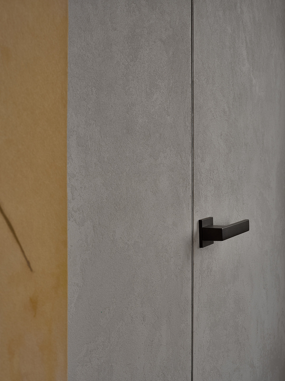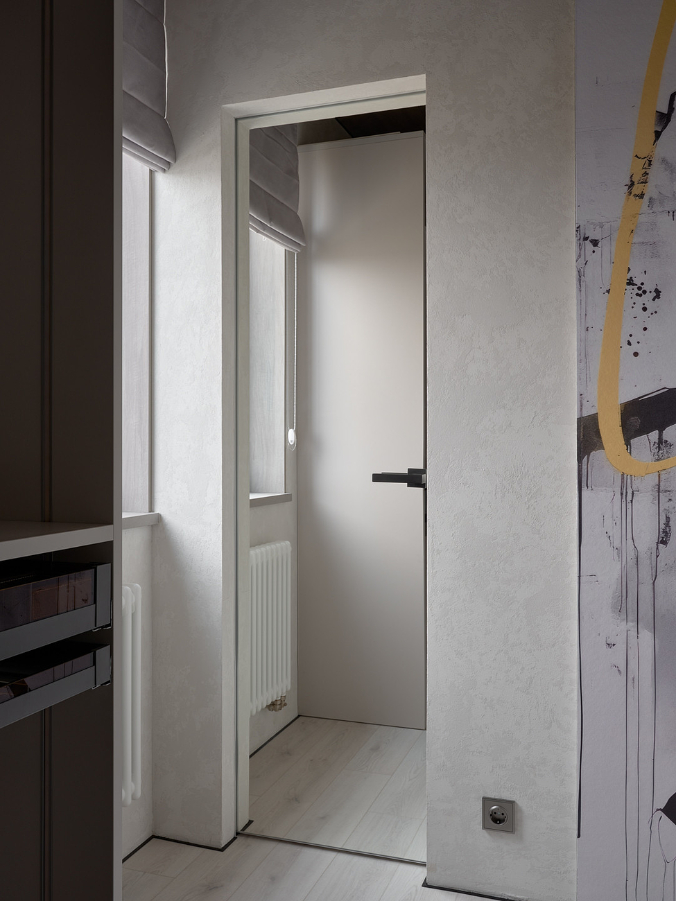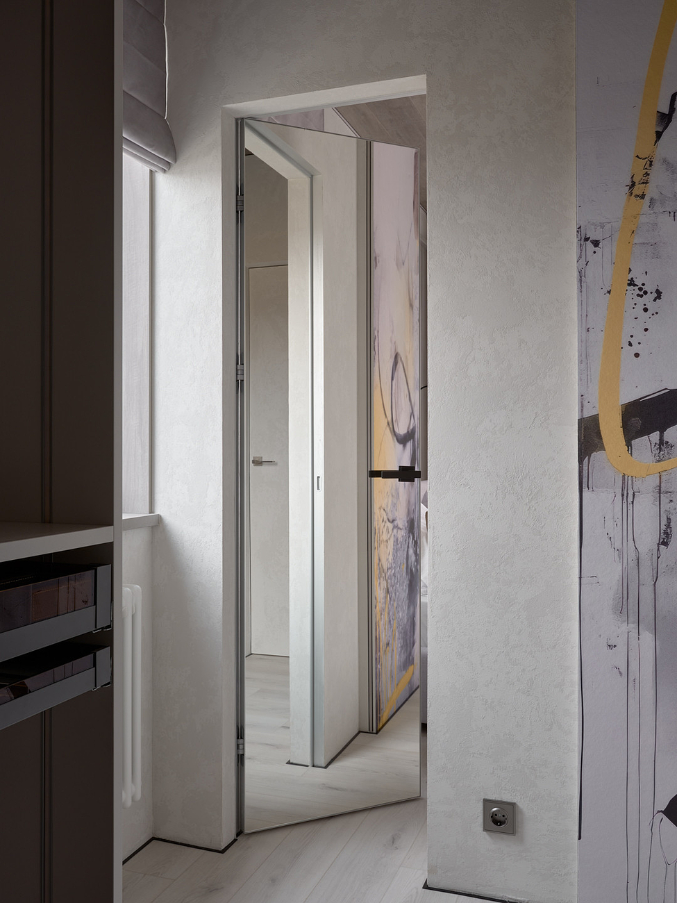 Новая дверь в гардеробную в скрытом алюминиевом коробе. Полотно щитовое, усиленное МДФ-панелью. Внутри материал из древесных волокон. Со стороны гардеробной дверь оформлена зеркалом.