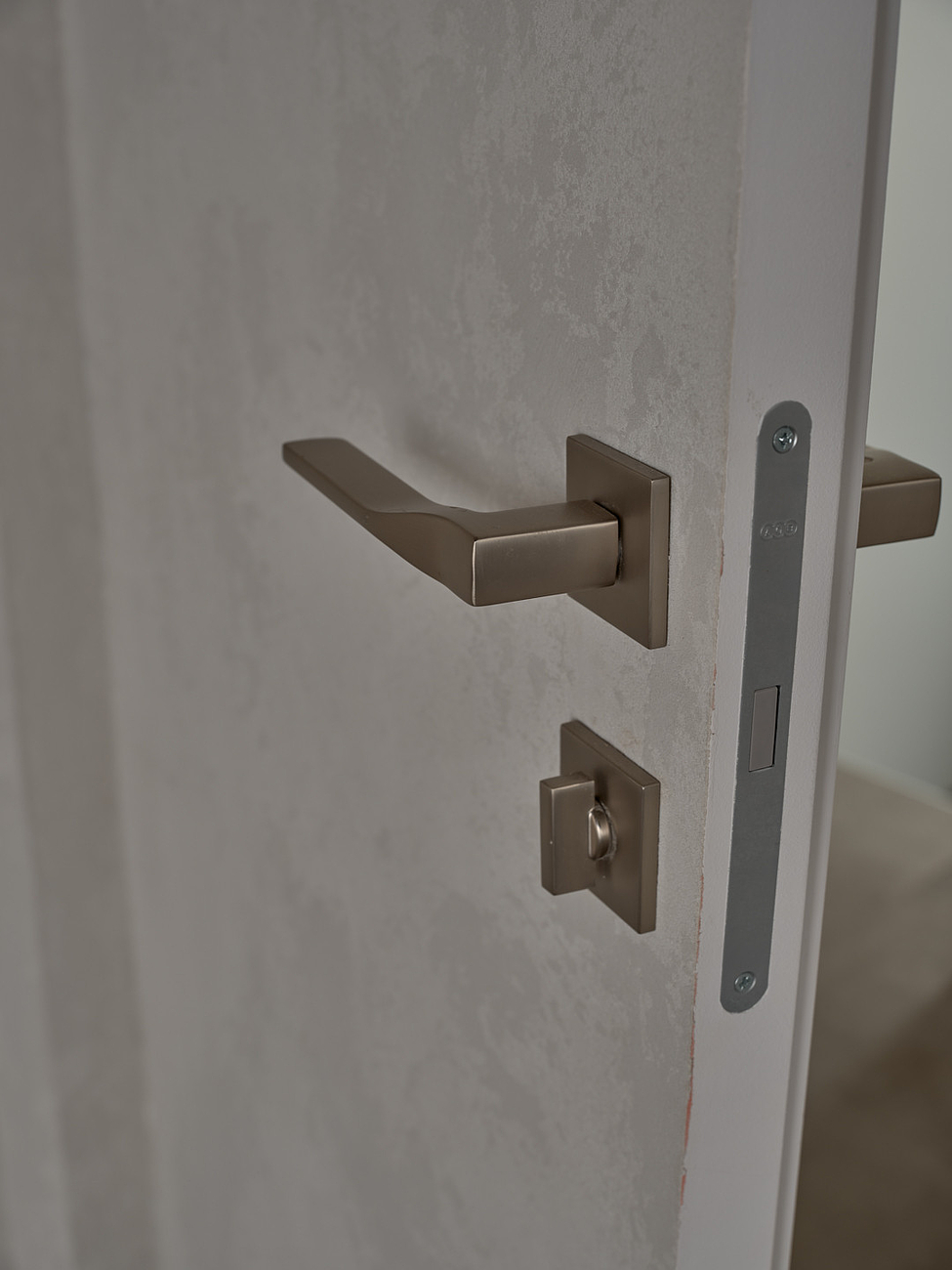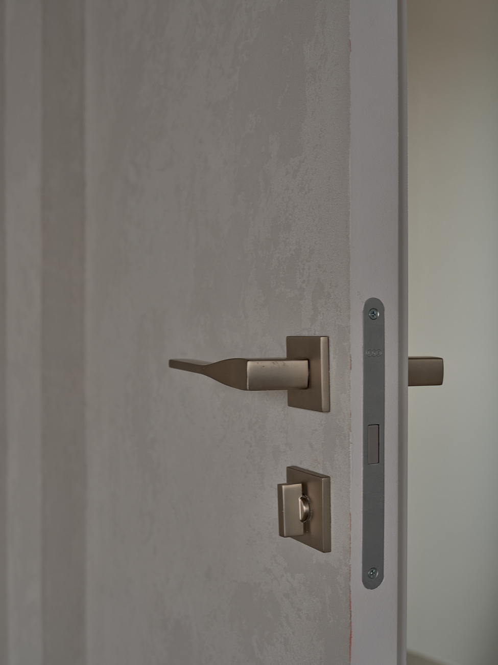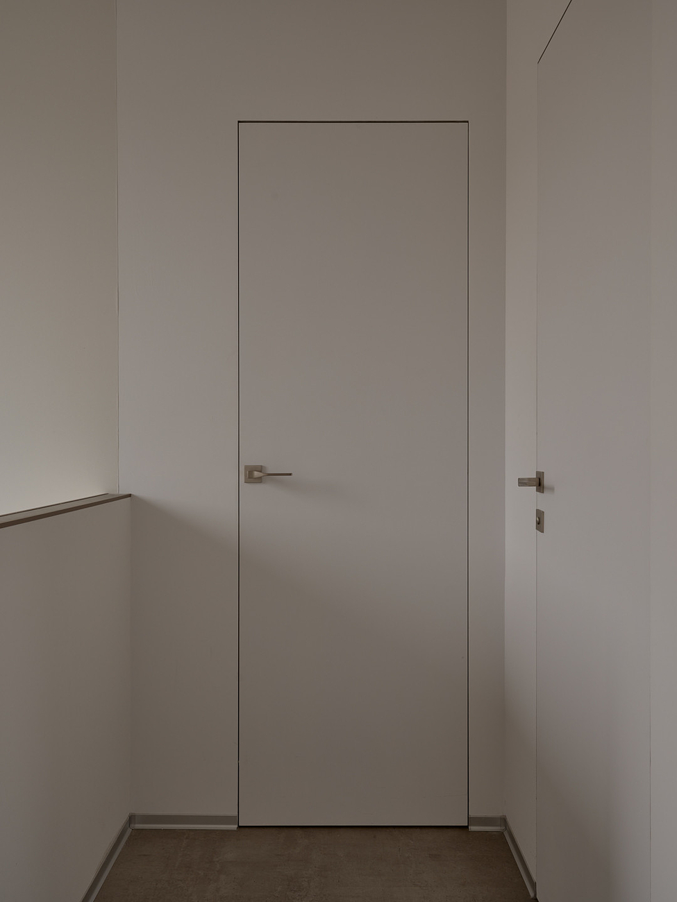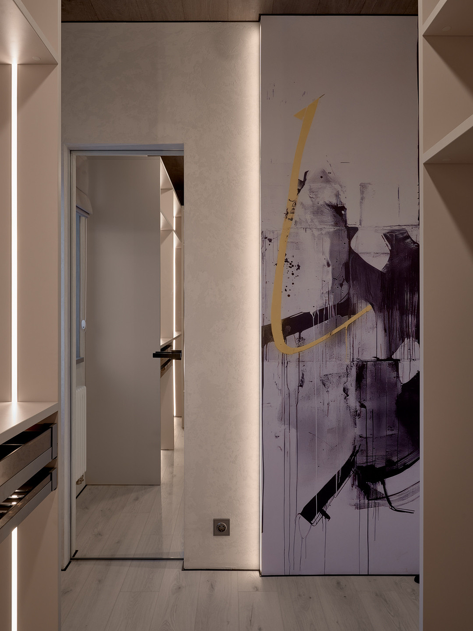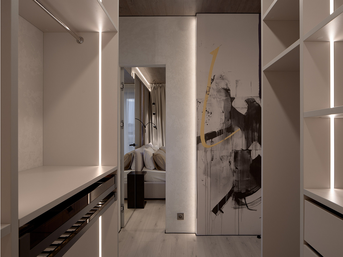 Новая дверь в гардеробную в скрытом алюминиевом коробе. Полотно щитовое, усиленное МДФ-панелью. Внутри материал из древесных волокон. Со стороны гардеробной дверь оформлена зеркалом.