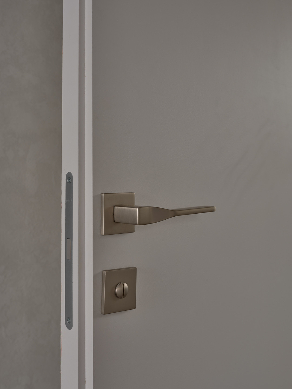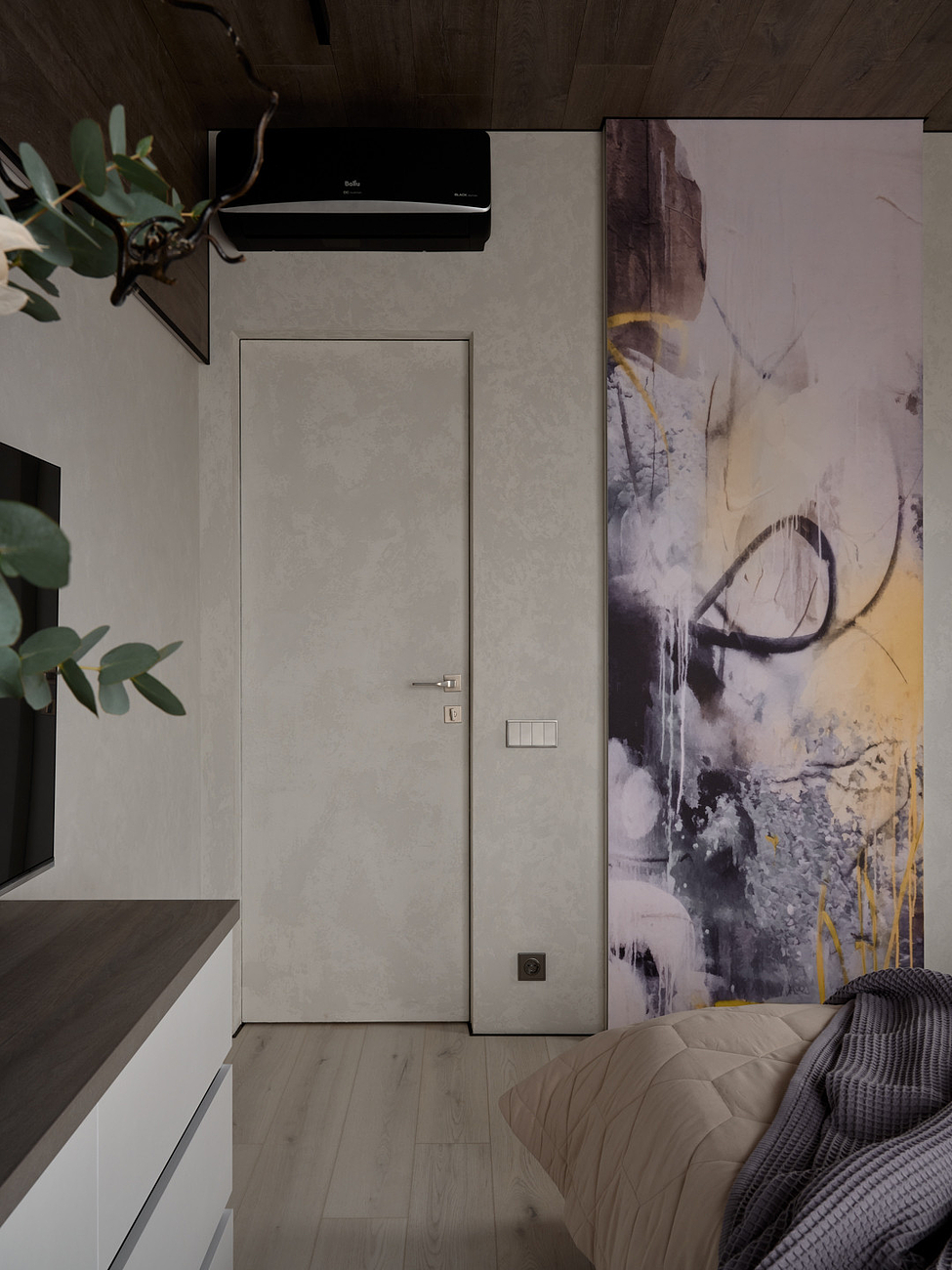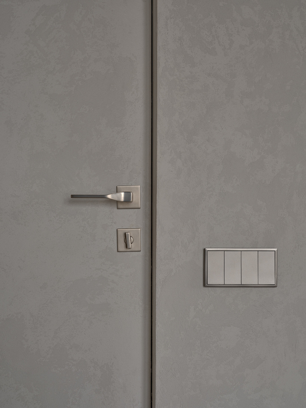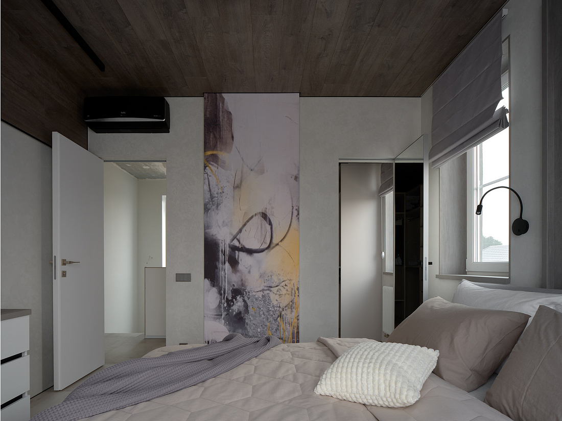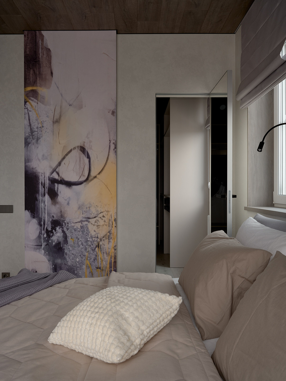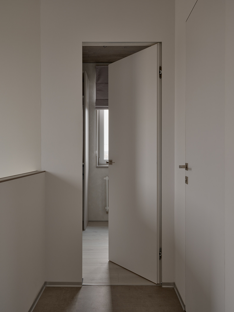 Новая дверь в гардеробную в скрытом алюминиевом коробе. Полотно щитовое, усиленное МДФ-панелью. Внутри материал из древесных волокон. Со стороны гардеробной дверь оформлена зеркалом.
