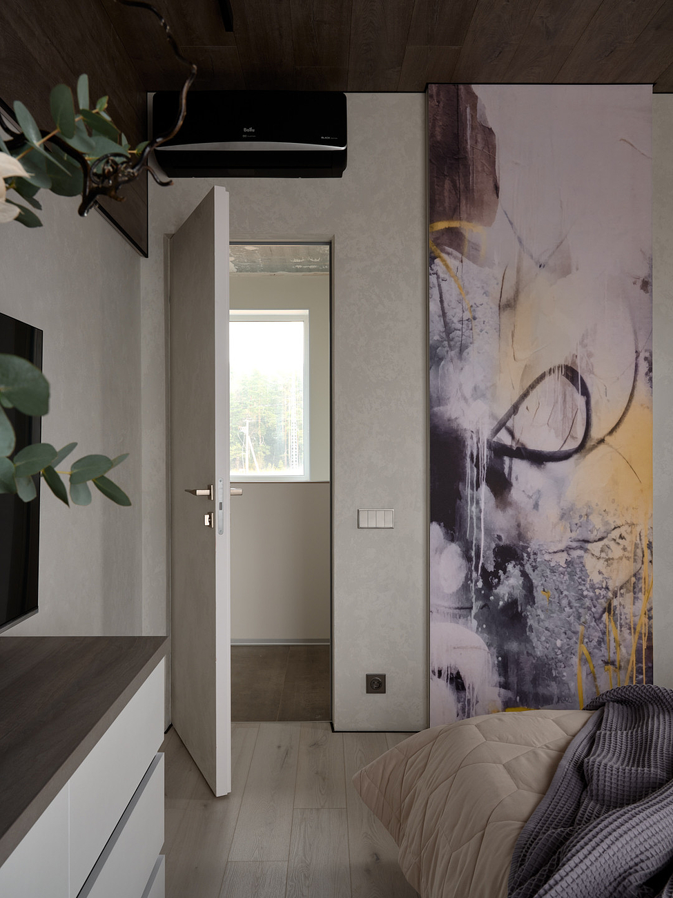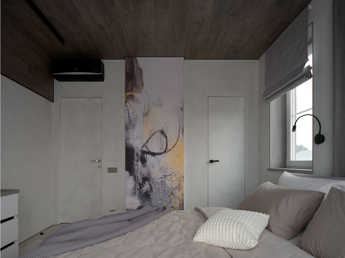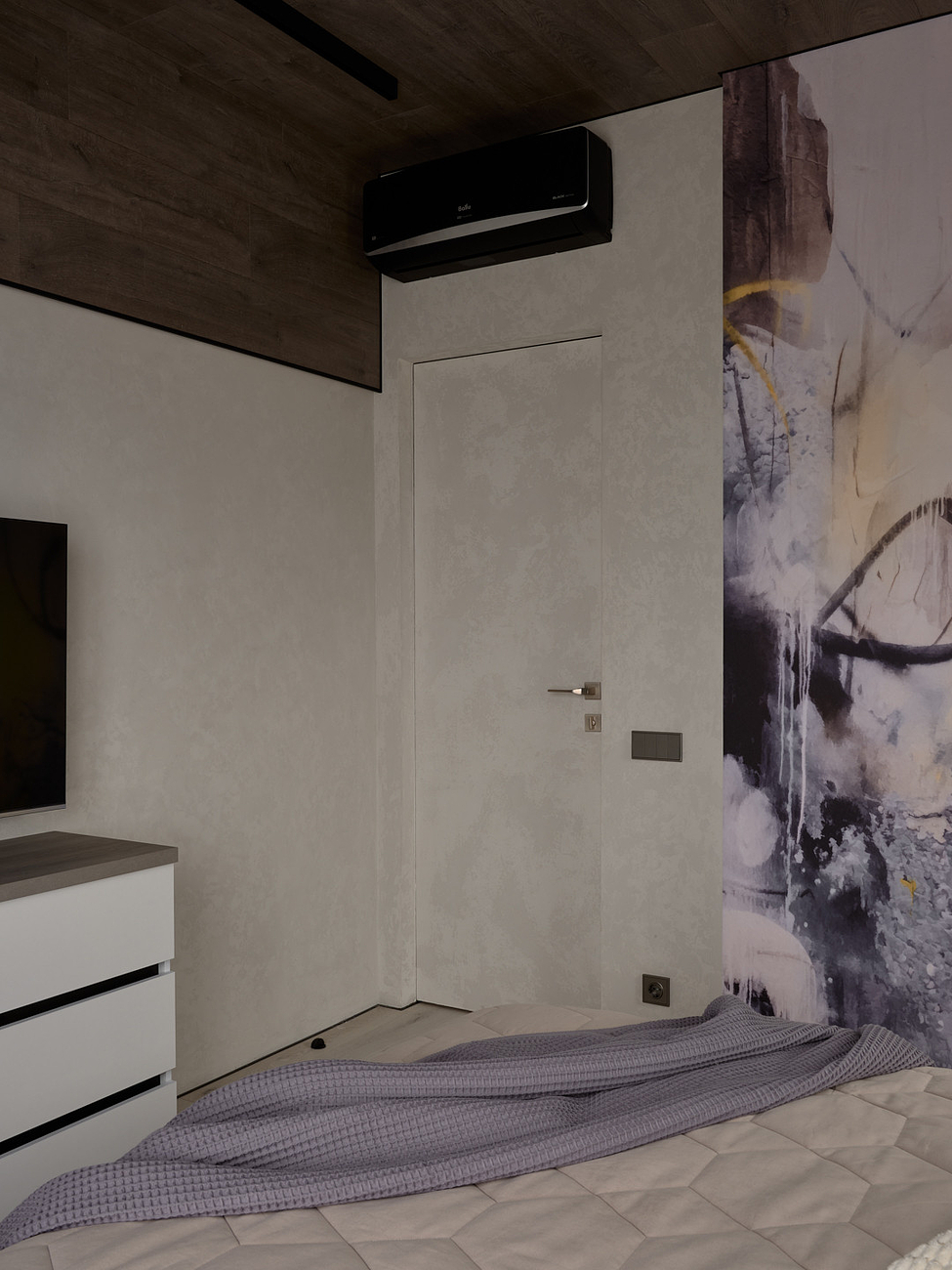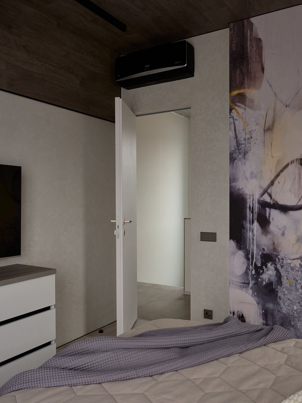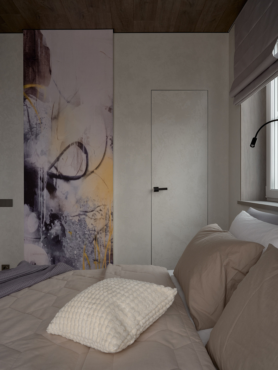 Новая дверь в гардеробную в скрытом алюминиевом коробе. Полотно щитовое, усиленное МДФ-панелью. Внутри материал из древесных волокон. Со стороны гардеробной дверь оформлена зеркалом.