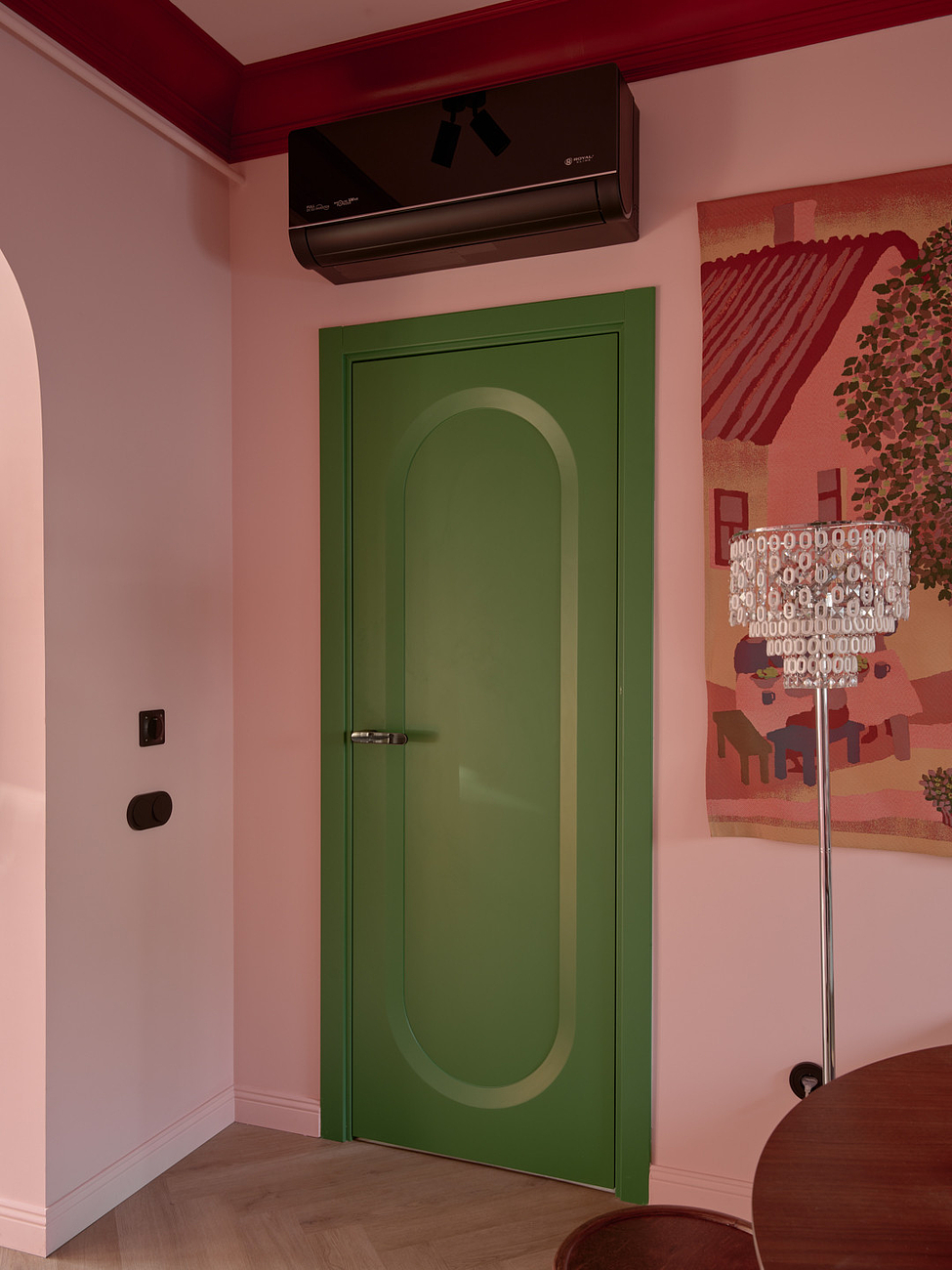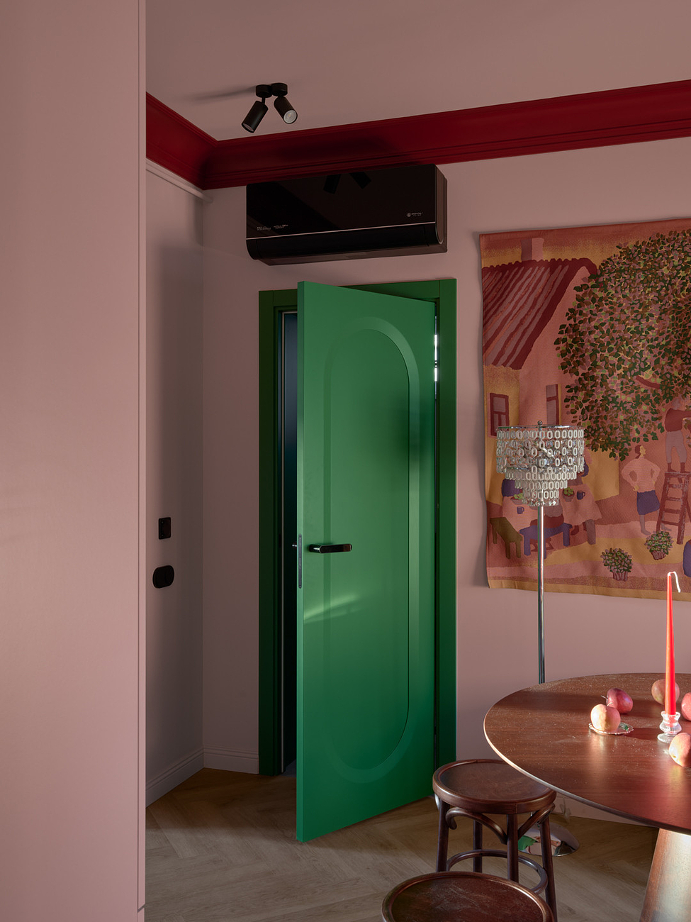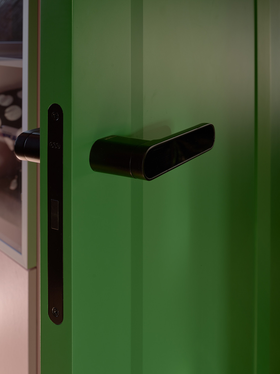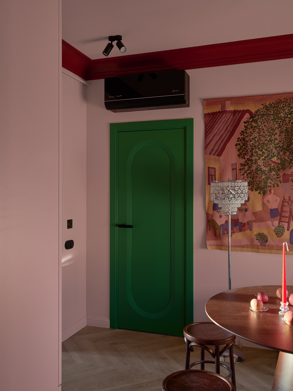 Двери добавили интерьеру сочной зелени. Они приехали на проект из Белоруси. Выполнены из МДФ и покрыты эмалью. Модель называется «Аргентум». Петли – скрытые, наличники – телескопические. Ручка повторят форму рельефа на полотне.