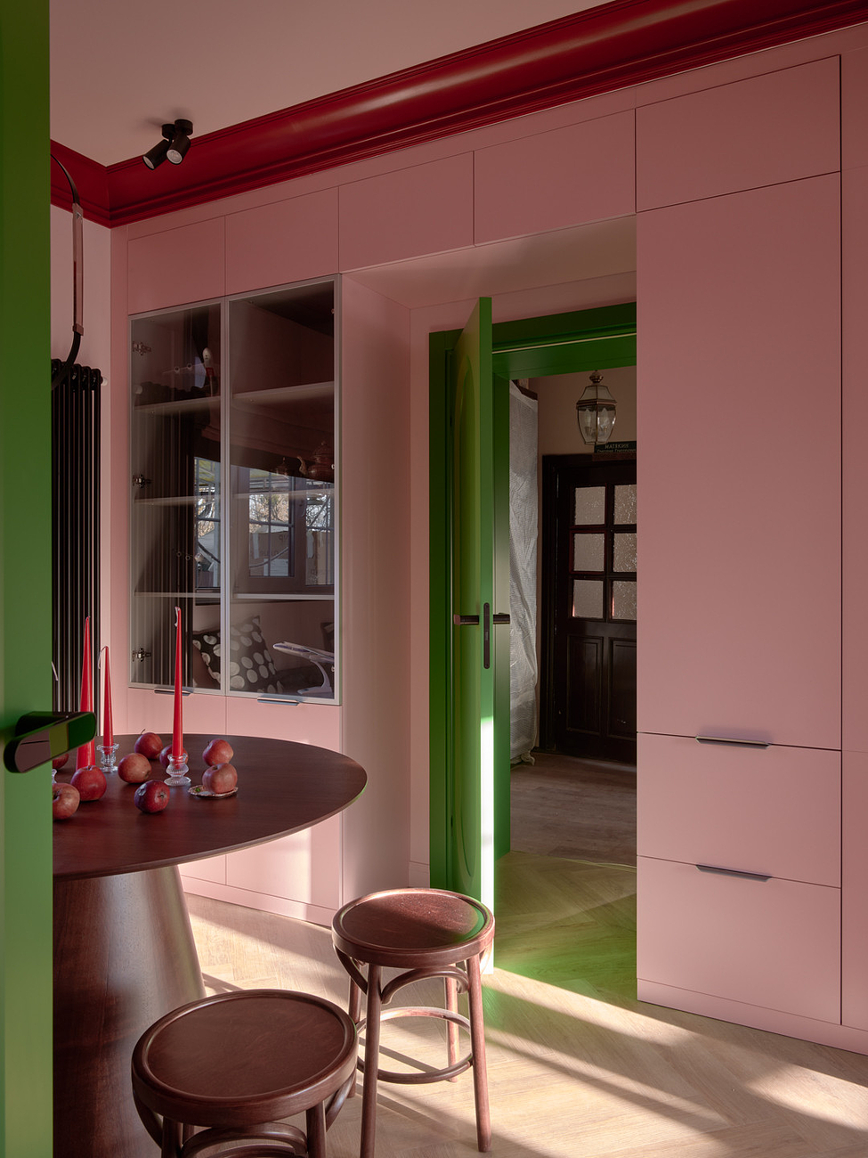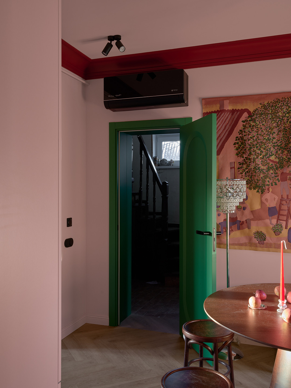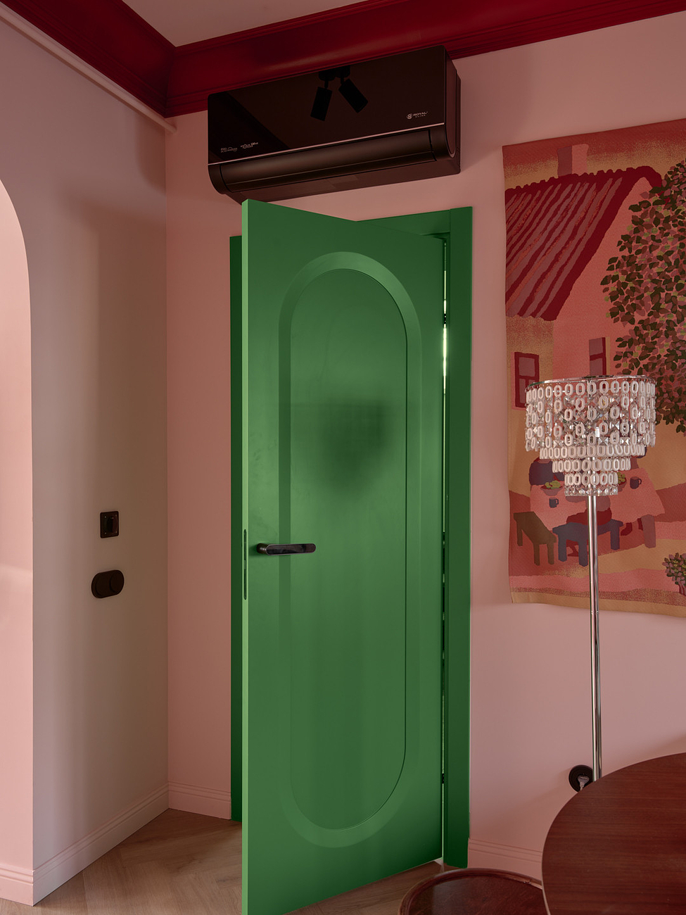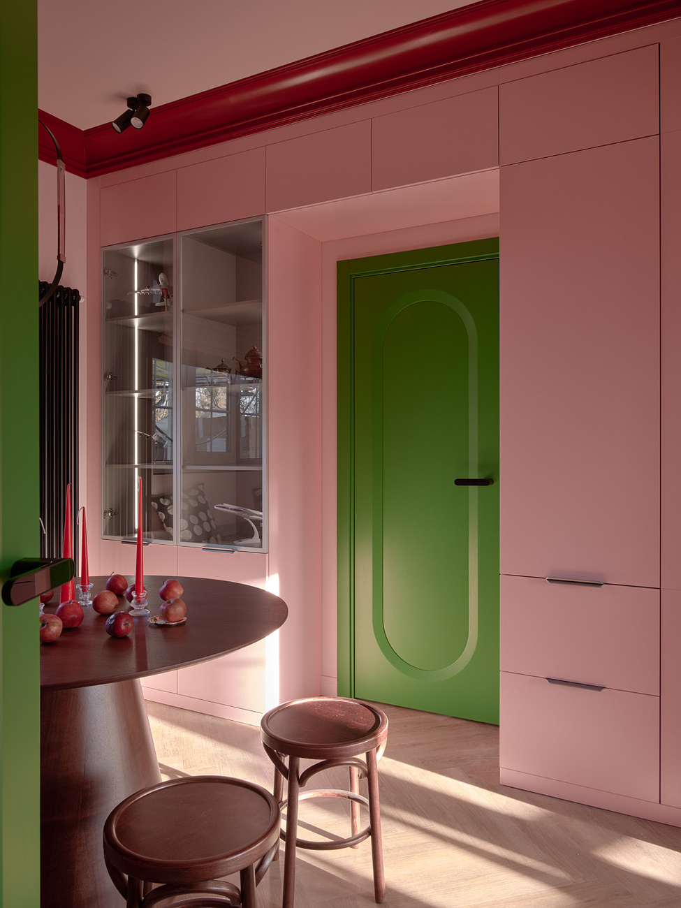 Двери добавили интерьеру сочной зелени. Они приехали на проект из Белоруси. Выполнены из МДФ и покрыты эмалью. Модель называется «Аргентум». Петли – скрытые, наличники – телескопические. Ручка повторят форму рельефа на полотне.
