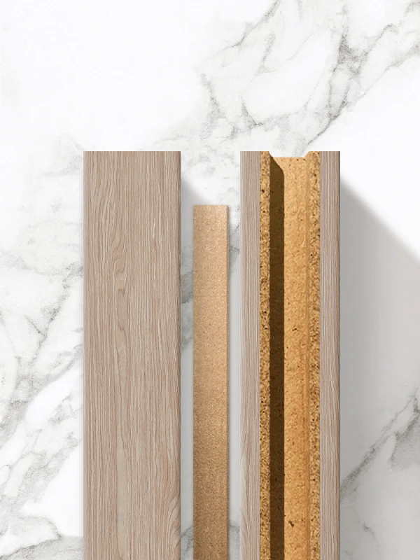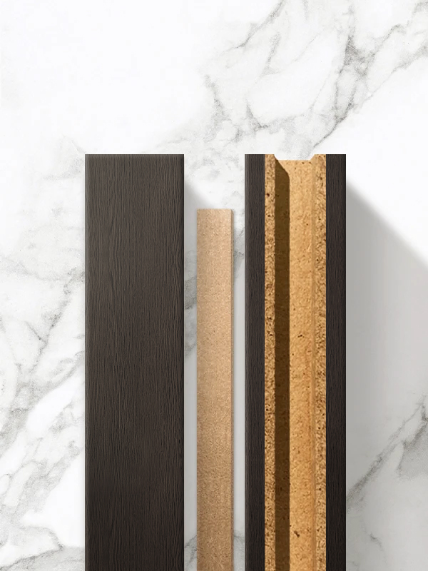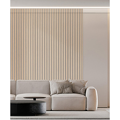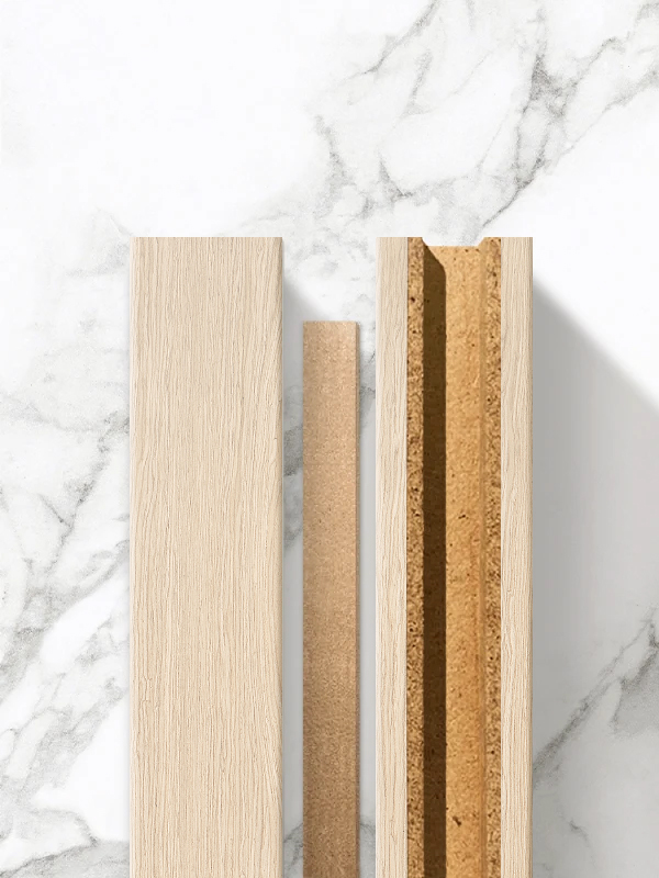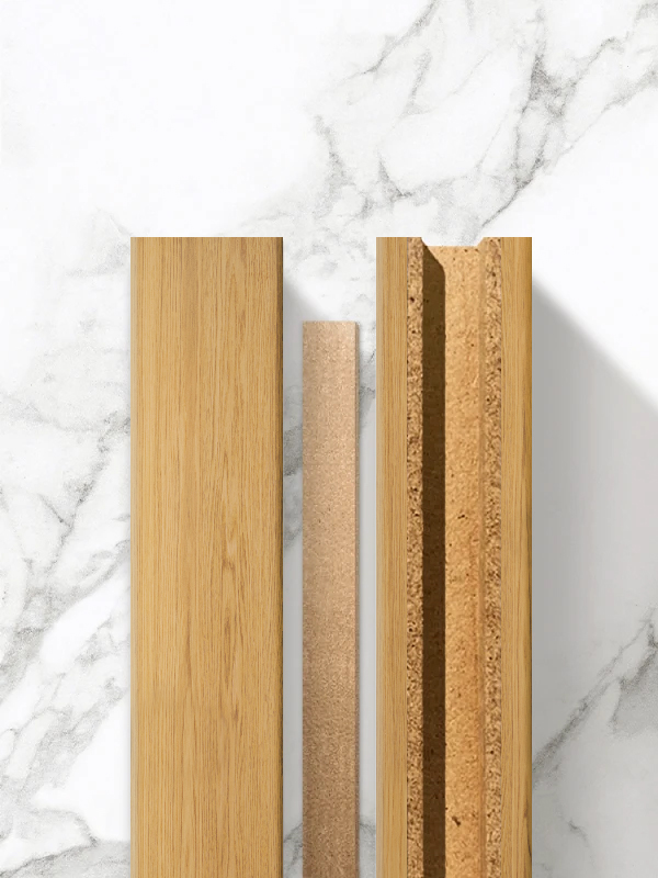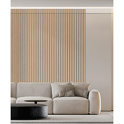 Реечные панели с пазом представляют собой параллелепипеды, покрытые натуральным шпоном дуба (натуральный, натуральный без отделки, матовый лак). Материал изготовления — МДФ.