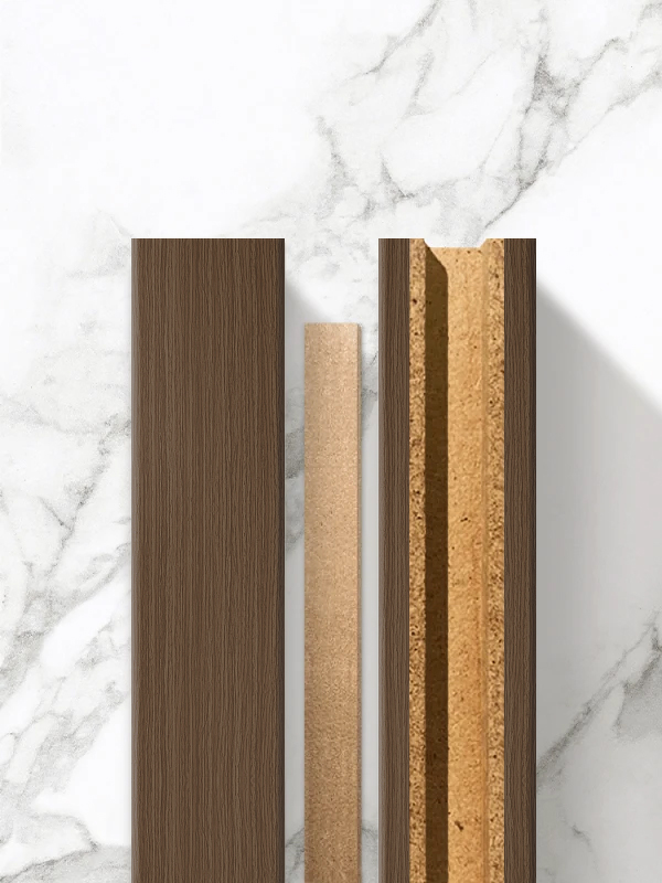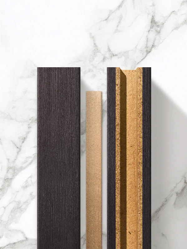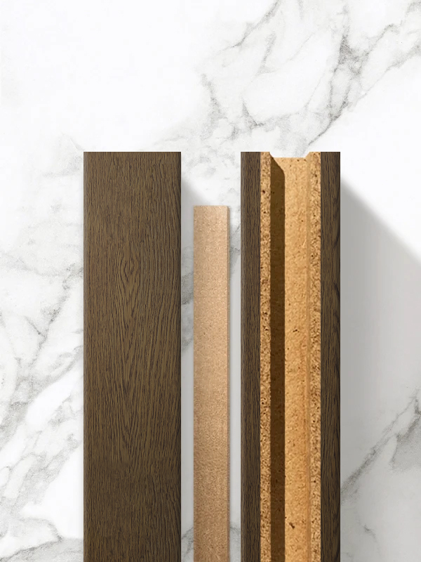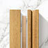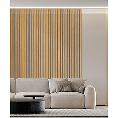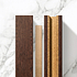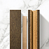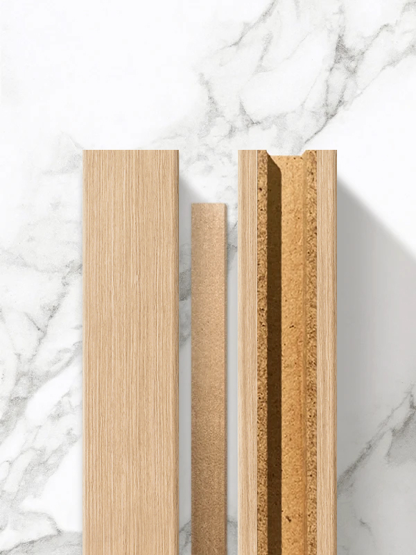 Реечные панели представляют собой параллелепипеды, покрытые натуральным шпоном дуба (натуральный, натуральный без отделки, матовый лак). Материал изготовления — МДФ.