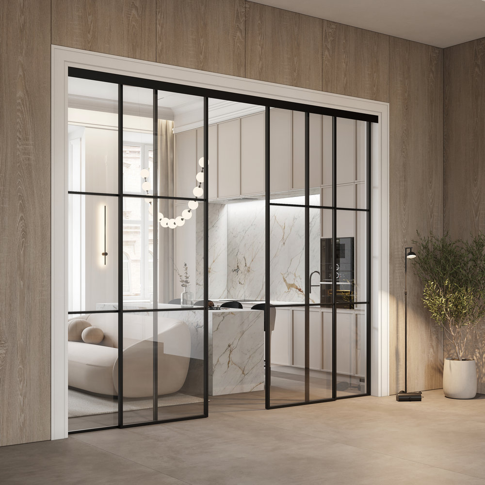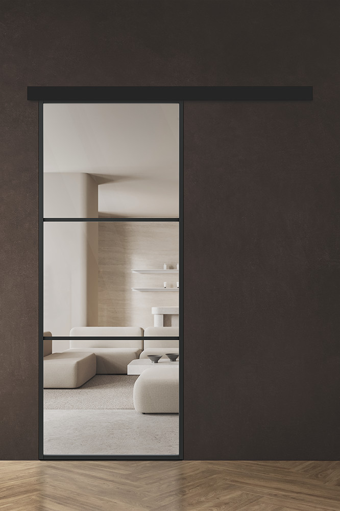Современный дизайн: стильные двери из алюминиевого профиля — оригинальный способ эффективно разделить пространство в доме или офисе. Центральным элементом дизайна является стеклянная вставка на весь размер полотна, которая зрительно увеличивает площадь комнаты, создавая комфортную, уютную атмосферу. Модель Спейс АП 2 подходит для раздвижной системы открывания (двери-купе).