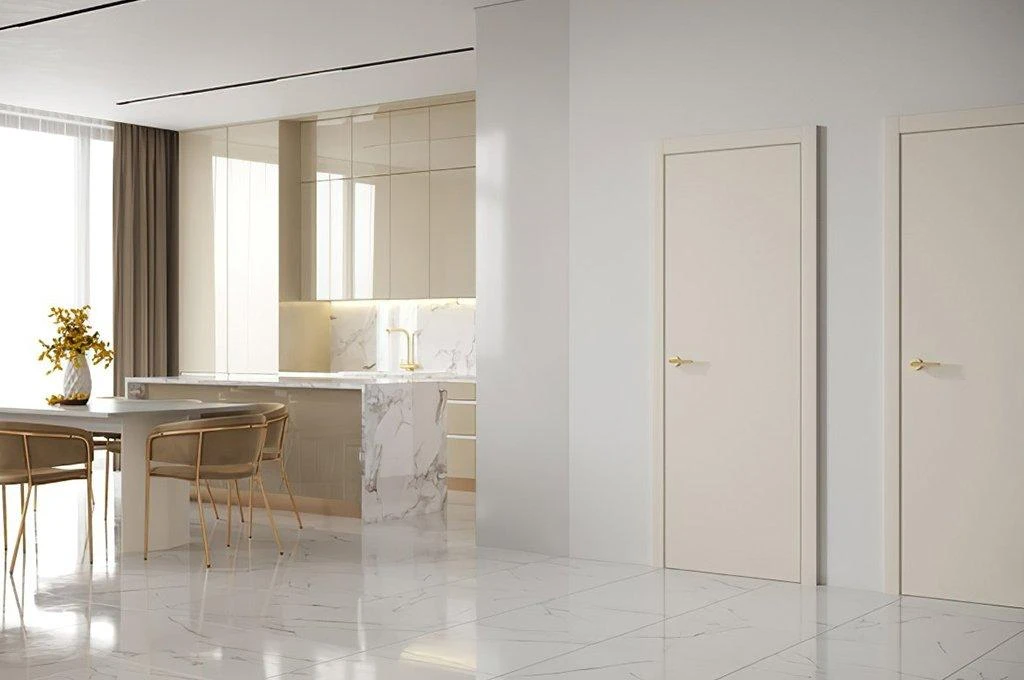 Это наличник, который образует единую плоскость с дверным полотном. Такое решение создаёт стильный минималистичный дизайн. В то же время обеспечивается экономия пространства, так как с наружной стороны дверь можно открыть полностью. Наружный наличник-компланар представляет собой накладную планку Г-образной формы, где короткая сторона соприкасается с торцом дверного полотна, а длинная прилегает к стене. С внутренней стороны дверей можно использовать телескопические наличники.