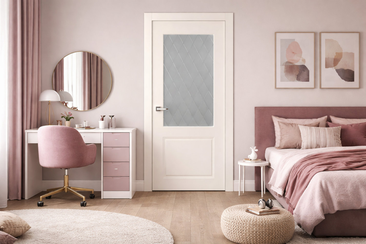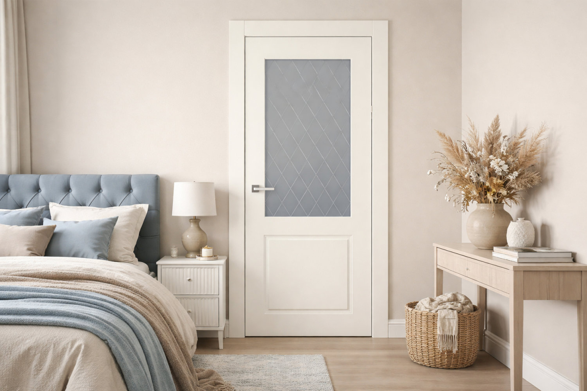 Стекло: витражное стекло Мателюкс белого цвета с матовым эффектом сохраняет приватность в комнате, при этом наполняя ее светом.