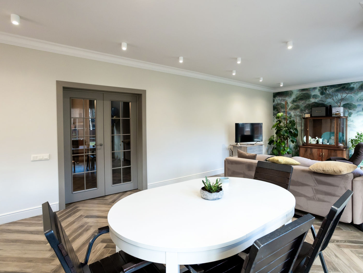 Это наличник, который образует единую плоскость с дверным полотном. Такое решение создаёт стильный минималистичный дизайн. В то же время обеспечивается экономия пространства, так как с наружной стороны дверь можно открыть полностью. Наружный наличник-компланар представляет собой накладную планку Г-образной формы, где короткая сторона соприкасается с торцом дверного полотна, а длинная прилегает к стене. С внутренней стороны дверей можно использовать телескопические наличники.