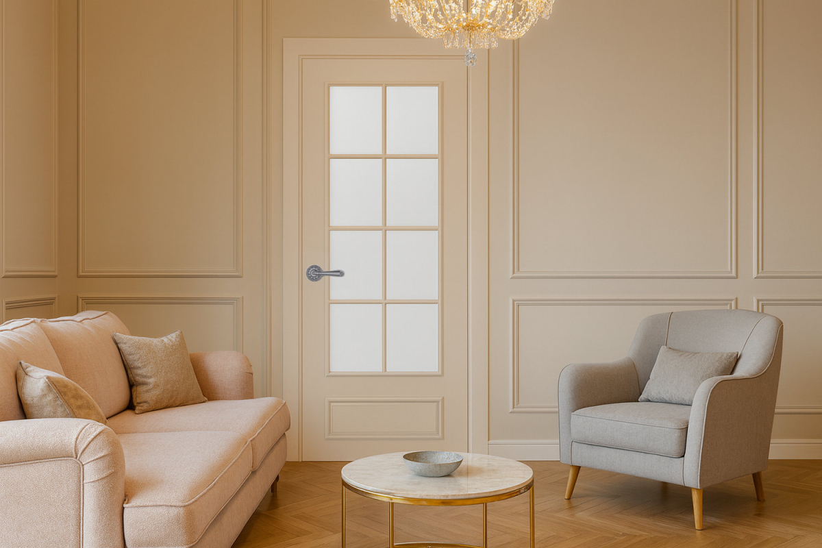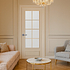 Современный дизайн: центральным элементом полотна является стекло, которое создает уютную обстановку и визуально делает помещение шире, а также небольшая филенка, обрамленная декоративным багетом. Межкомнатная дверь белорусского производства из массива дерева во французском стиле Ламира 5 позволяет сочетать в одном интерьере различные текстуры, цвета, материалы.