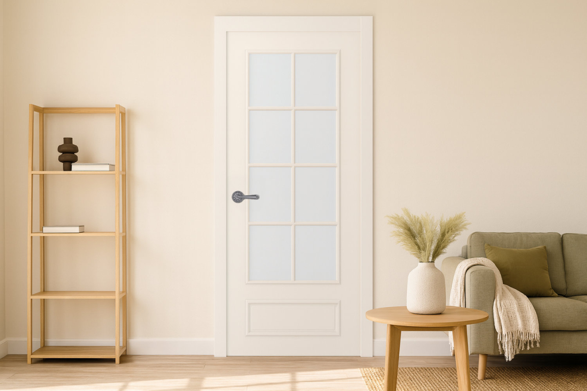 - закаленное безопасное стекло Мателюкс белого цвета с матовым эффектом с обеих сторон, которое сохраняет приватность в комнате, слегка наполняя ее светом.