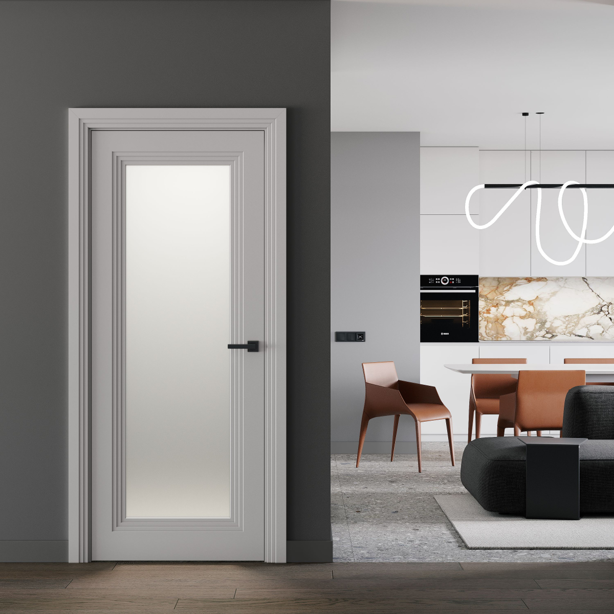 Современный дизайн: граничащая между модерном и неоклассикой межкомнатная дверь Левел 1 украшена стеклянной вставкой и глубокой ступенчатой фрезеровкой, которые вместе будут эффектно смотреться в любом интерьере, слегка наполняя его светом и визуально расширяя пространство.