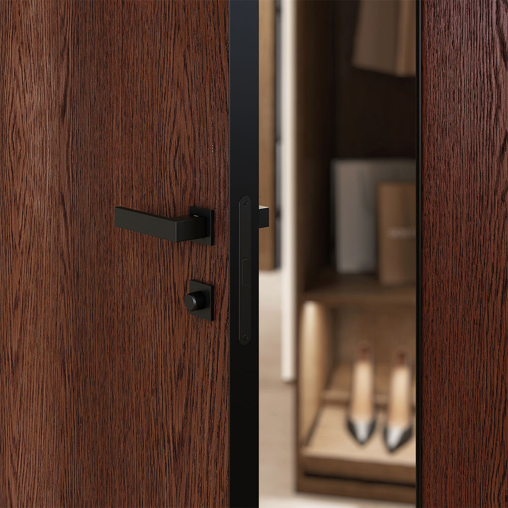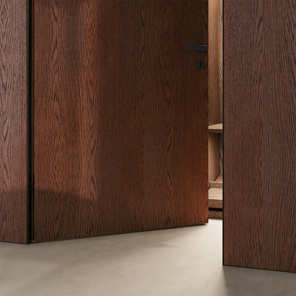Это наличник, который образует единую плоскость с дверным полотном. Такое решение создаёт стильный минималистичный дизайн. В то же время обеспечивается экономия пространства, так как с наружной стороны дверь можно открыть полностью. Наружный наличник-компланар представляет собой накладную планку Г-образной формы, где короткая сторона соприкасается с торцом дверного полотна, а длинная прилегает к стене. С внутренней стороны дверей можно использовать телескопические наличники.