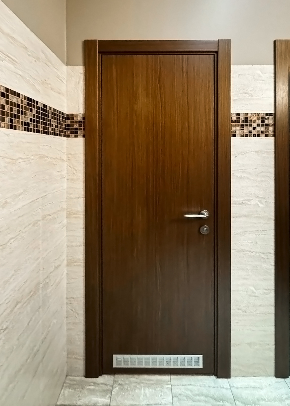 Качественная финишная отделка: подобранный вручную натуральный шпон ясеня в несколько слоев покрыт эмалью. Она наносится специальным роботом и защищает поверхность двери от влаги и механических повреждений.