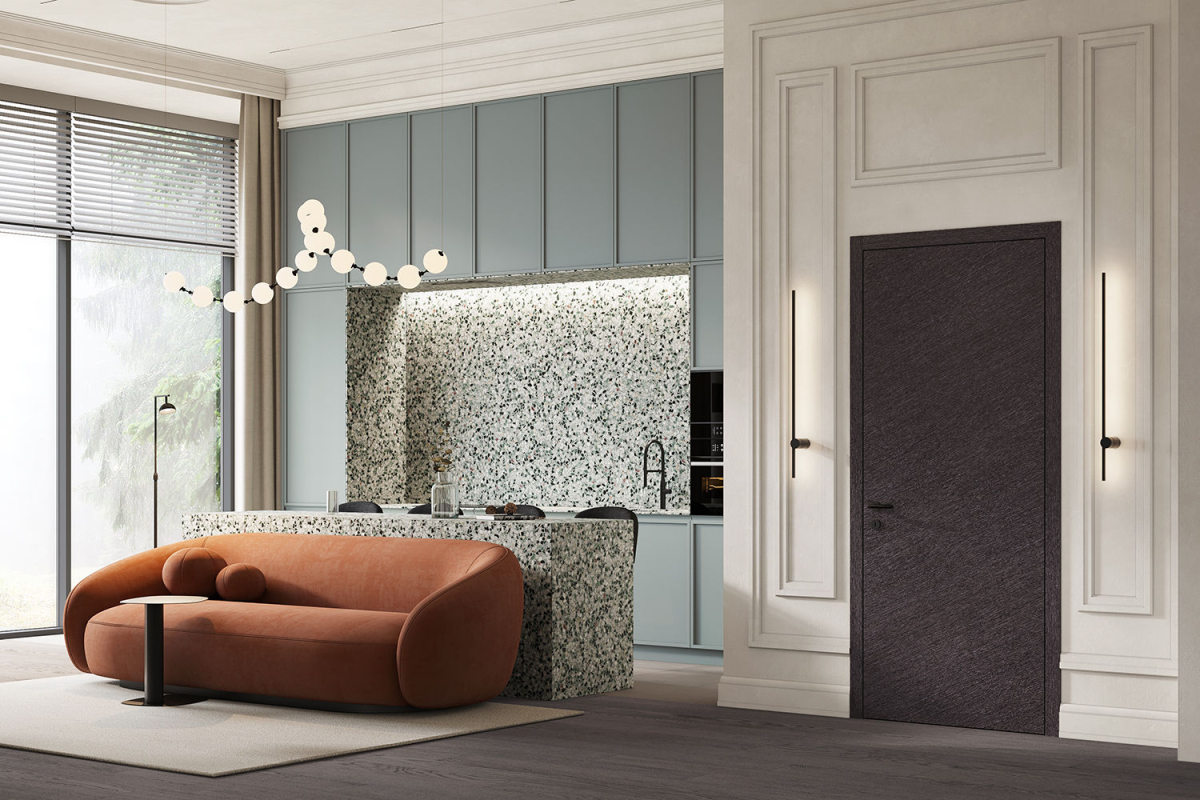 Это наличник, который образует единую плоскость с дверным полотном. Такое решение создаёт стильный минималистичный дизайн. В то же время обеспечивается экономия пространства, так как с наружной стороны дверь можно открыть полностью. Наружный наличник-компланар представляет собой накладную планку Г-образной формы, где короткая сторона соприкасается с торцом дверного полотна, а длинная прилегает к стене. С внутренней стороны дверей можно использовать телескопические наличники.
